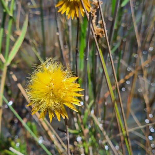 This beautiful golden everlasting daisy is endemic to south-eastern Australia (https://vicflora.rbg.vic.gov.au/flora/taxon/xerochrysum_palustre). It grows in seasonal or permanent wetlands and swamps scattered from near Portland in western Victoria to Bairnsdale in the east, also occurring in NSW and Tasmania. It is perennial, grows 30-100 cm tall and has showy flowers up to 5 cm across which appear from November to March. It dies off in late summer, and resprouts in winter-spring, depending on rain. The Swamp Everlasting is listed as Critically Endangered under Victoria’s Flora and Fauna Guarantee Act 1988, and as Vulnerable under the Commonwealth Environment Protection and Biodiversity Conservation Act 1999 reflecting a range of threats to the long-term persistence of populations, including land clearing, altered hydrology, weed invasion and grazing.